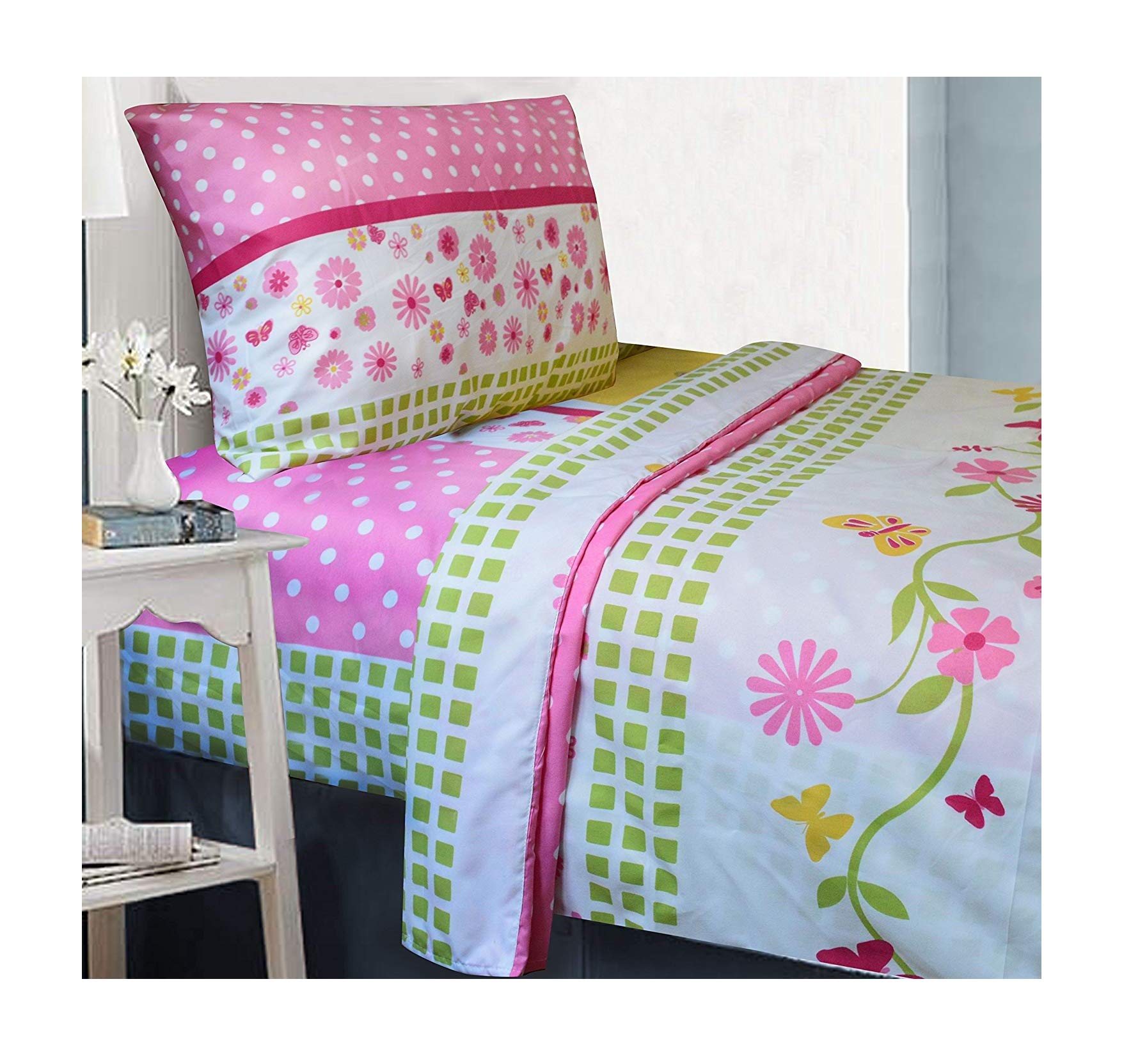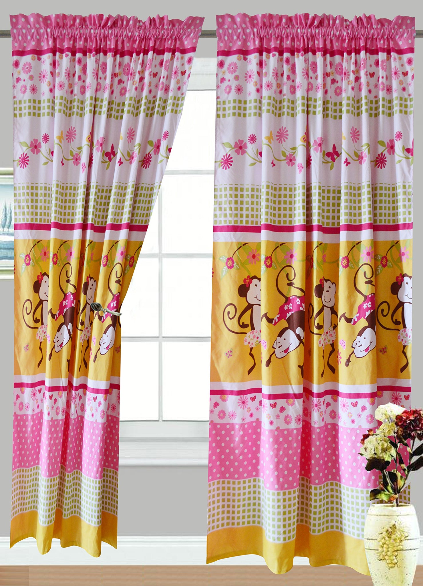 Details: Upgrade your child's bedroom into the cutest pad in the jungle with the Monkey Business comforter set. The comforter forms the centerpiece of the room with a design of happy monkeys hanging around an eclectic pattern of checks, flowers and polka dots. The vibrant color scheme of yellow, pink, green and white is carried through to the included pillow sham. Comforter measures 64" x 86" There's also a cute accent cushion in the shape of a winking monkey's face that's guaranteed to be your child's new favorite friend! Be sure to check out the matching curtain and sheet sets for a complete bedroom makeover.